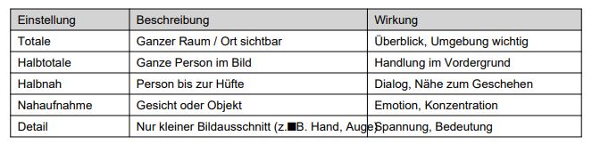 • Mindestens 3 verschiedene Kameraeinstellungen (z. B. Totale, Halbnah, Nahaufnahme)